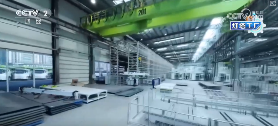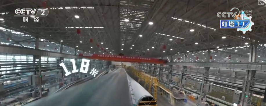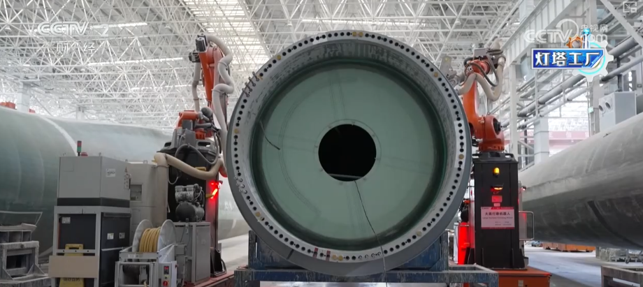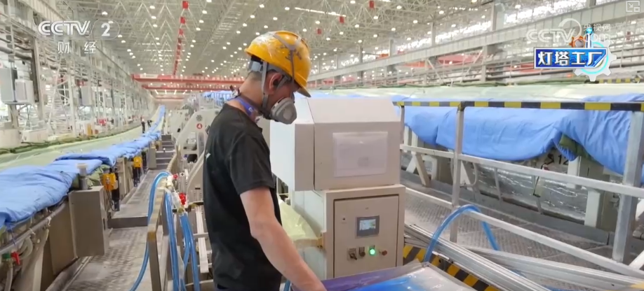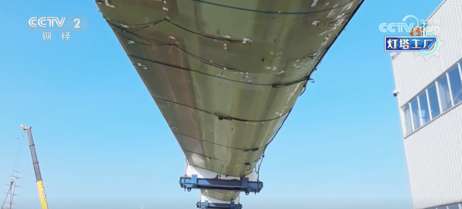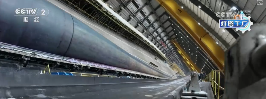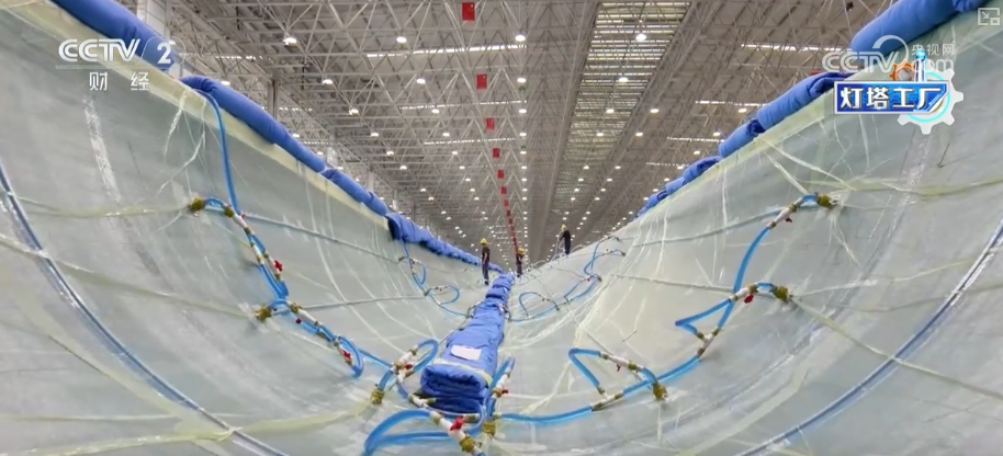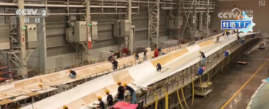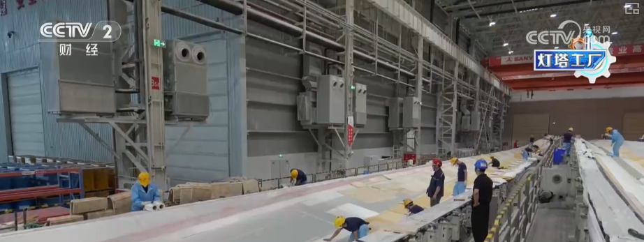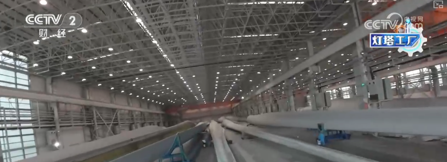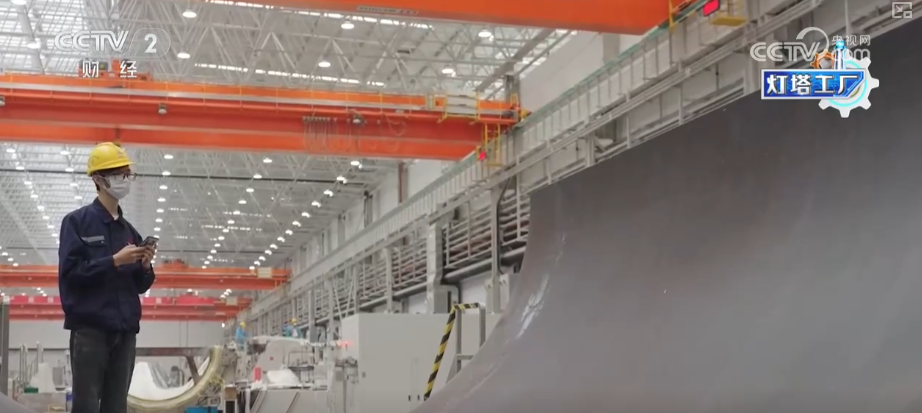 这里是湖南韶山这个的叶片工厂,这个大家伙就是风机叶片。目前,这家“灯塔工厂”最长可以生产118米的叶片。像这样的一只百米级叶片,生产时间也从原来的平均40多个小时,缩短到现在的30个小时左右。