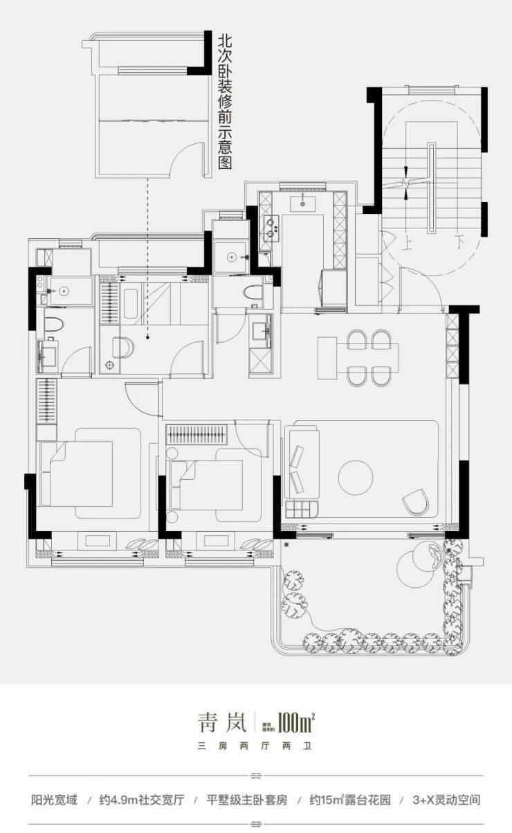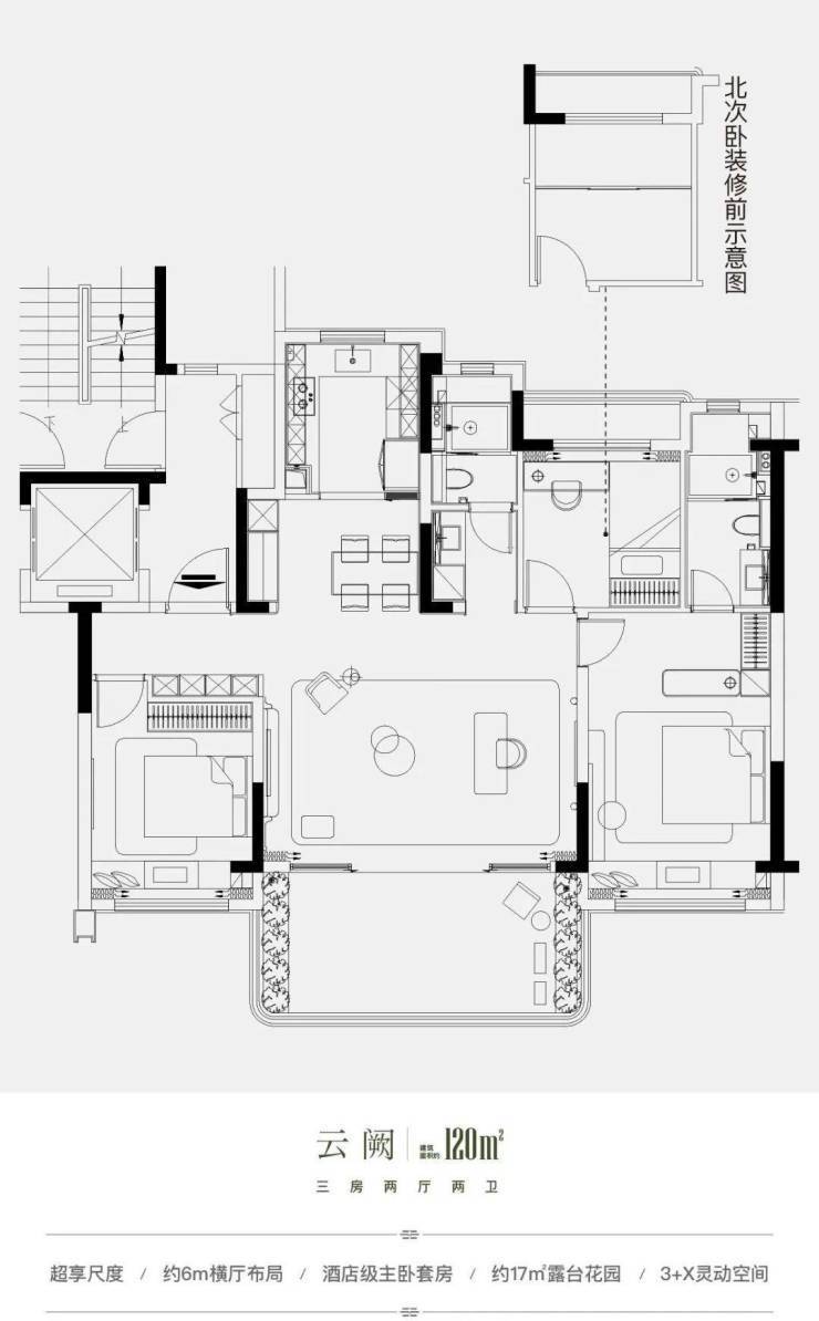 设计亮点:零公摊设计(实际使用率超100%),6米横厅、U型厨房、灵动X空间等