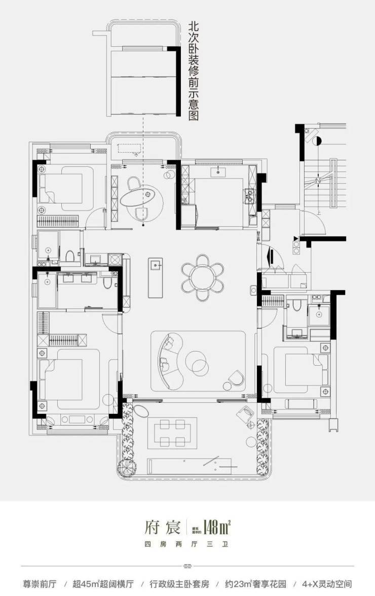 主力户型:建面约100-148㎡,涵盖三房至四房,户户配备15-23㎡空中花园(挑高约6米)